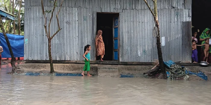 টানা বর্ষণে মেঘনা নদীর অতিরিক্ত জোয়ারের পানি ঢুকে পড়েছে উপকূলীয় এলাকাতে।
